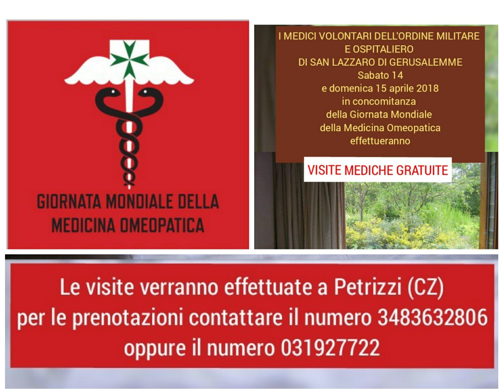 In occasione della Giornata Mondiale della Medicina Omeopatica, che ricorre il 10 aprile, la dott.ssa Rosalba Ranieri, Elemosiniere dell’Ordine Militare e Ospitaliero di San Lazzaro di Gerusalemme e Responsabile dei Medici Volontari, organizza per sabato 14 e domenica 15 aprile 2018 a Petrizzi (CZ), due giornate di Visite Mediche Omeopatiche gratuite. Per prenotazioni: tel. 031 927722 – 348 363 2806.